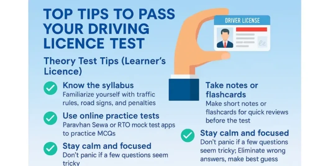 Within the Sarathi test vehicle context, practise with the exact class of vehicle you’ll be tested in (two‑wheeler with gear, LMV, etc)
